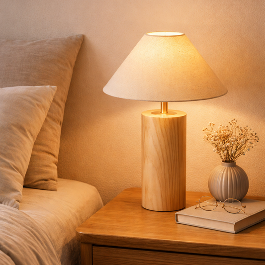 Oslo Natural Wood Artisan Lamp with Linen Shade